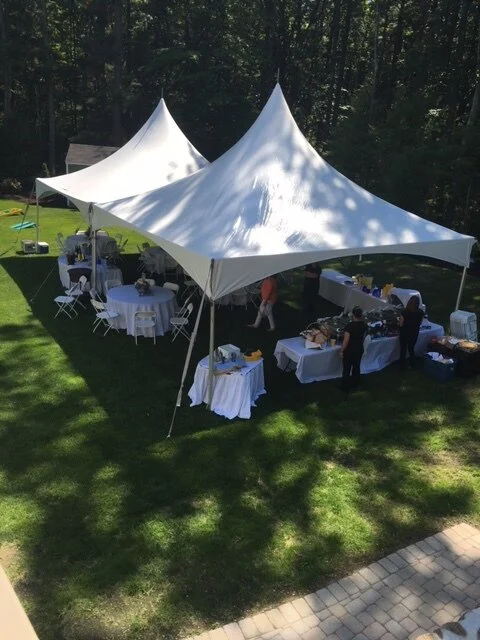 20x30 white, high-peak, frame tent (no center pole, “open floor-plan,” can be placed in tight spaces)